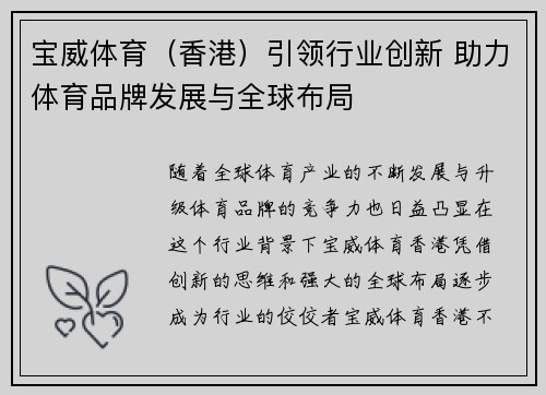 随着全球体育产业的不断发展与升级,体育品牌的竞争力也日益凸显。在这个行业背景下,宝威体育(香港)凭借创新的思维和强大的全球布局,逐步成为行业的佼佼者。宝威体育(香港)不仅关注市场需求,还通过技术创新、品牌塑造和全球化战略等多个维度推动体育产业的发展。本文将从四个方面详细探讨宝威体育(香港)如何引领行业创新,助力体育品牌发展与全球布局。通过分析其在创新能力、市场策略、全球扩展和品牌合作等方面的成功经验,深入了解宝威体育(香港)如何在全球体育行业中占据一席之地,并为其他品牌提供借鉴。本文力求全面展示宝威体育(香港)如何通过其战略举措,引领行业走向未来。